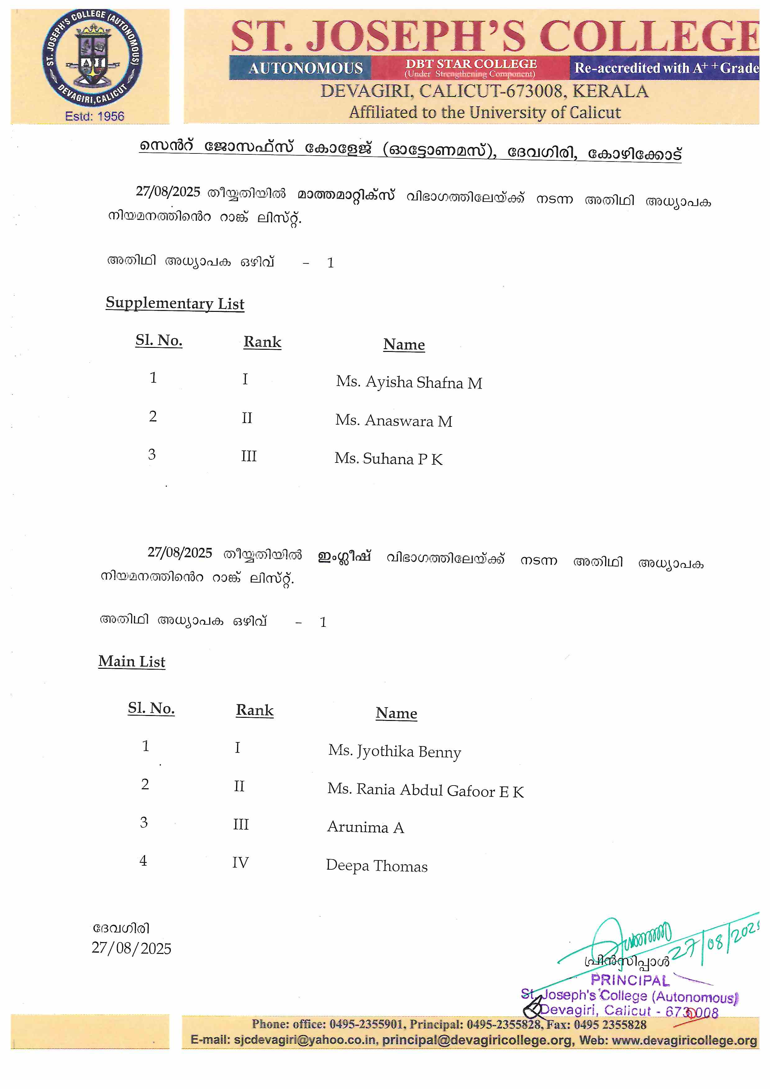 Guest Lecturer Interview Rank List - Mathematics & English